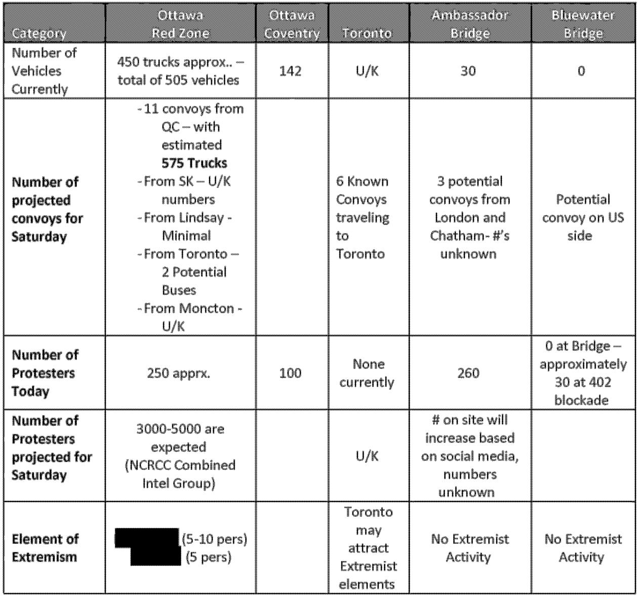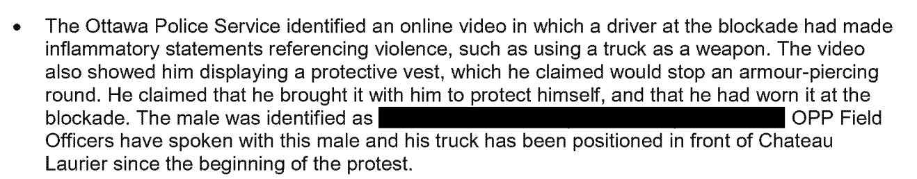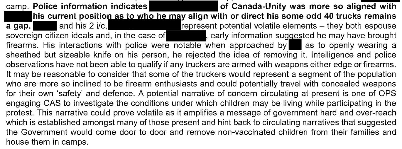 On January 25, just days before the convoy arrived, the OPP identified several intelligence “gaps,” including "the extent of extremist participation in convoy protest and intent of extremist actors; potential for some participants to bring weapons or be armed."
