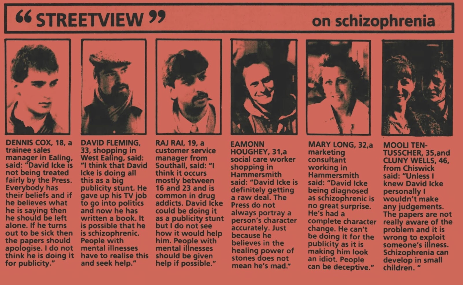 When the Ealing & Acton Gazette ran a story about Icke, asking “is this man gifted or ill?” it tried to paint him as a sufferer of undiagnosed schizophrenia. They put that question to locals on the streets of West London. Maybe he’s ill, maybe he’s not, they concluded — but the media’s treatment of him has been the real problem.