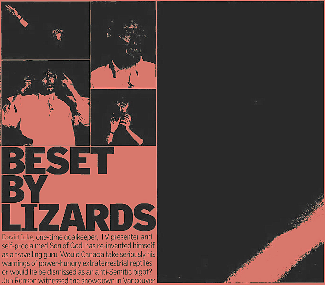 In 2001 Ronson flew to Vancouver, for The Guardian, in advance of Icke’s book tour arriving in the West Coast Canadian city.