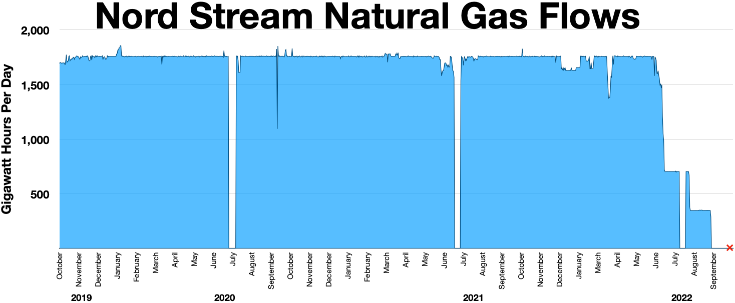 Which brings us to September. Nord Stream 1 is offline indefinitely, Nord Stream 2 is dead. Gas prices are skyrocketing in Europe, causing further populist ruptures across the continent. And suddenly, Nord Stream blows up.