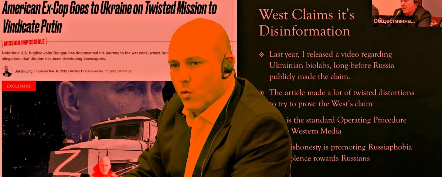 Russia is actively leaning on Westerns to advance these crazytown claims. American John Mark Dougan made an appearance at an official Russian government hearing in recently to offer his own spin on the conspiracy theory. (I have a little cameo!)